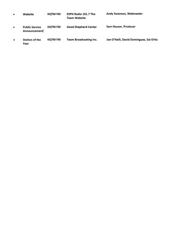 In addition to Station of The Year, ESPN Radio 101.7 The TEAM earned awards for the following categories: