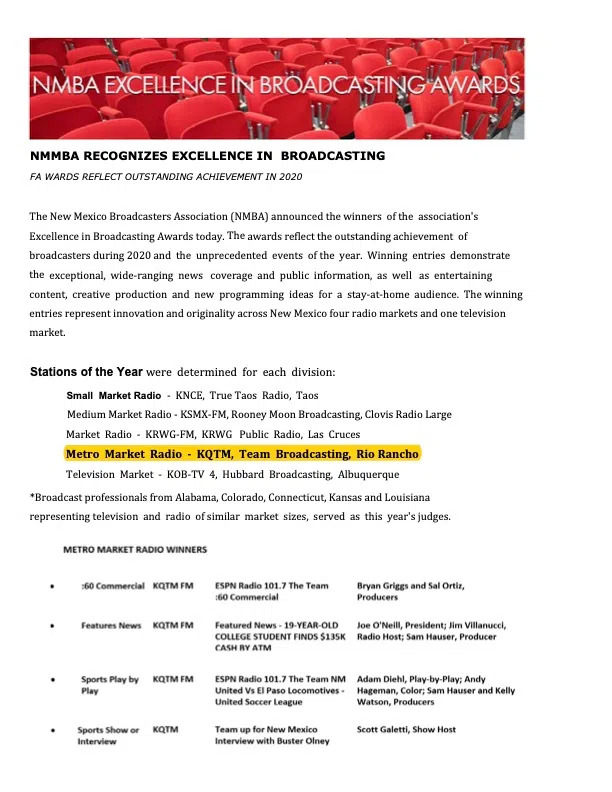 We are excited to announce that ESPN Radio 101.7 The TEAM has been named NMBA Metro Market Radio Station of the year for 2020. Thank you to all of our loyal listeners who have made the trying 2020 year a success. The TEAM focused on helping our community during the COVID-19 Pandemic with TEAM up for New Mexico and TEAM Up For Teachers, along with other community-building projects like the Good Shepherd Center radiothon.