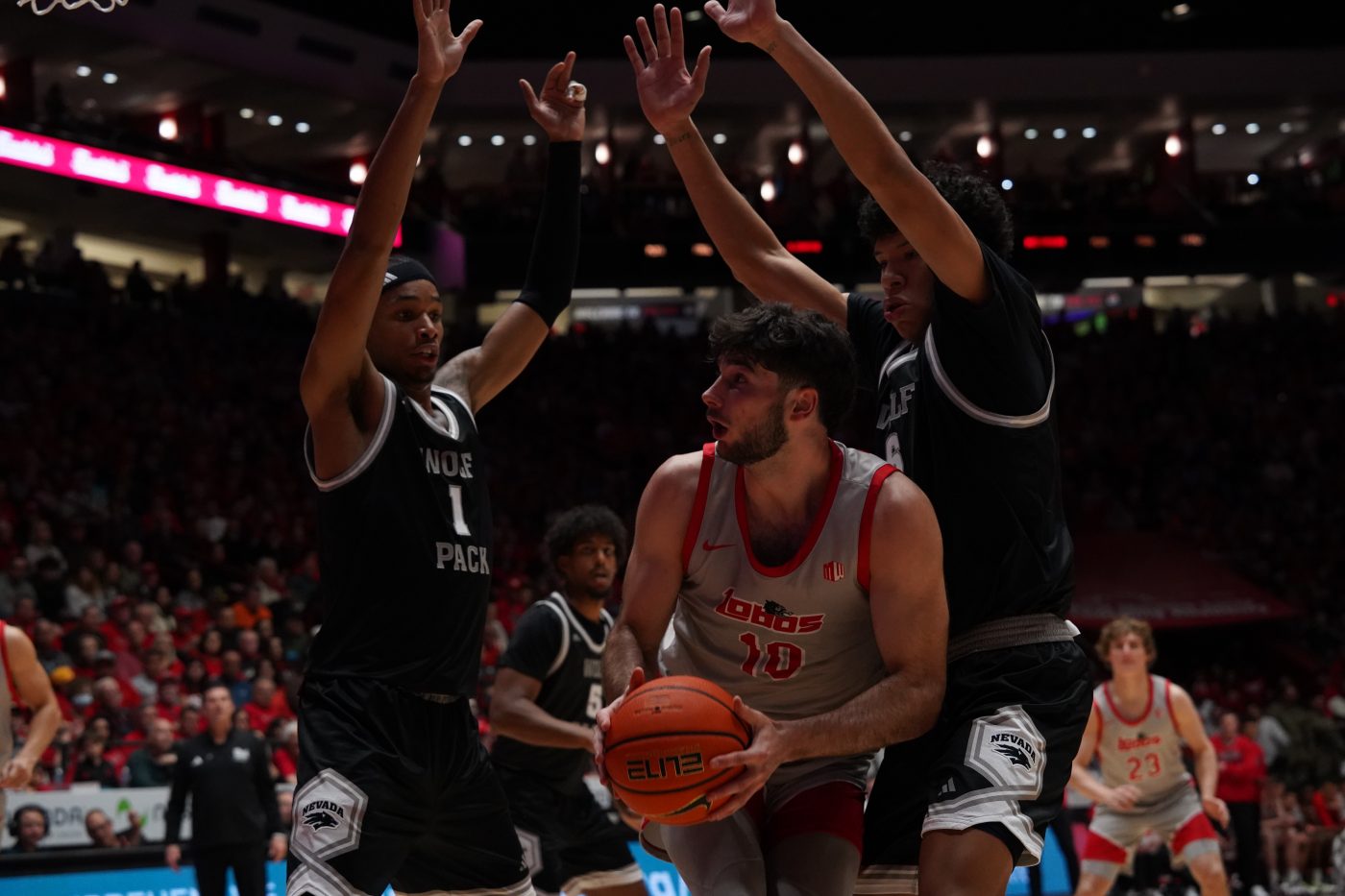 Saturday night brought an even tougher test, as Nevada came into The Pit riding momentum of its own. After falling behind by nine early in the second half, the Lobos stormed back for an 80–73 victory, their fifth straight win over the Wolf Pack. Hall was electric from beyond the arc, pouring in 19 points on five three-pointers to break Kendall Williams’ long-standing freshman record with his 59th triple of the season.